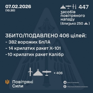 За попередніми даними, станом на 10:30, протиповітряною обороною збито/подавлено 406 цілей – 24 ракети та 382 безпілотники різних типів: